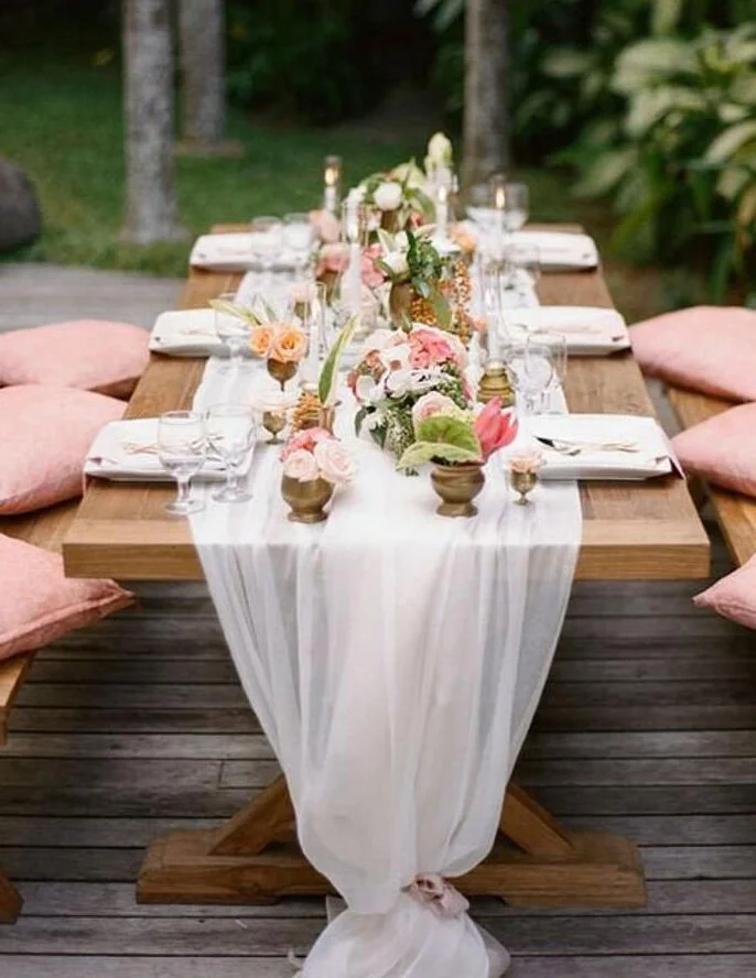 Adding chiffon table runners to the picnic tables or small floral centrepieces to the wine barrels adds for a more formal look. You could also add vintage furniture on the lawn for sitting area and photo backdrops are also always a huge hit for your guests to strike a pose! You can also think about adding a fun element to your cocktail hour like signature drinks, or a champagne toast!